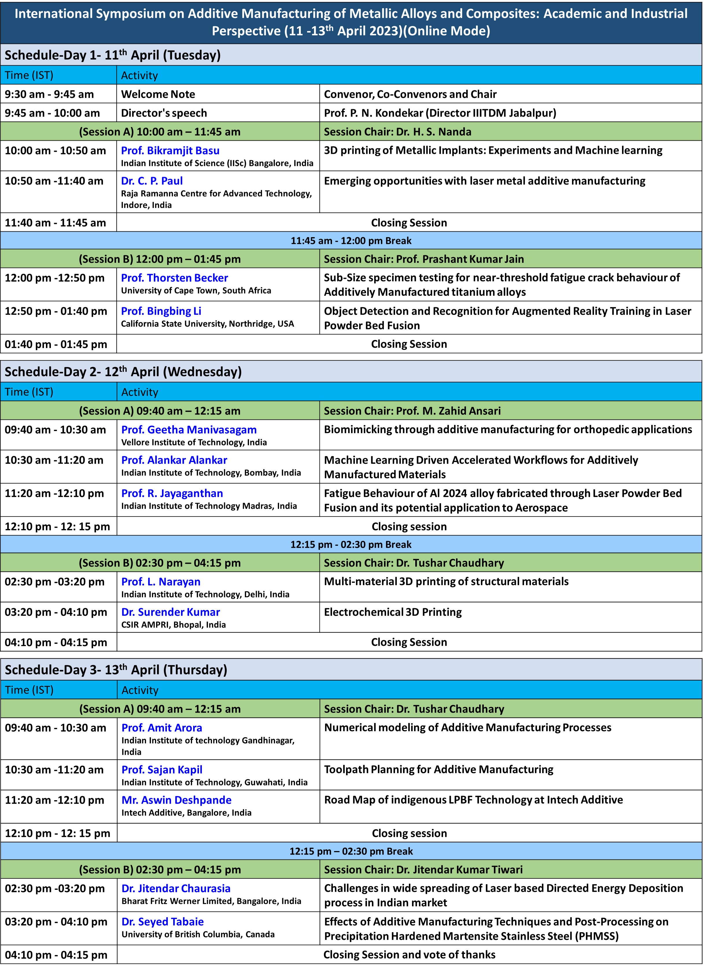 3. As Co-Convenor organized three days, International Symposium on "Additive Manufacturing of Metallic Alloys and Composites: Academic and Industrial Perspective" April 11-13, 2023